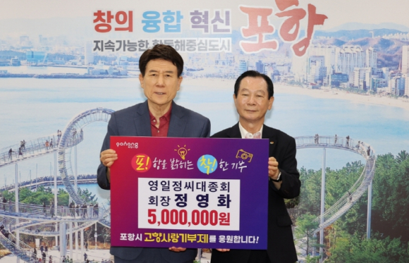 포항시는 25일 시청 대외협력실에서 정영화 영일정씨대종회 회장이 고향사랑기부금 500만 원을 기탁했다고 밝혔다. 포항시 남구 대송면에 위치한 ‘남성재’는 영일정씨 형양공파의 시조인 정습명 선생의 재실로, 정 회장은 이곳에서 거행되는 시제에 꾸준히 참가하고 종친회 활동을 이끌며 조상의 얼과 전통을 계승해 오고 있다. 이번 기부는 오랜 세월 종친회 활동으로 포항과의 인연을 이어온 정 회장이 지역 발전에 기여하고자 하는 뜻을 실천한 것으로, 조상의 뿌리를 기리는 마음에서 비롯된 것이어서 더욱 의미가 깊다. 정 회장은 “조상의 얼이 깃든 포항에 작은 정성을 보탤 수 있어 감사한 마음이며, 지역사회에 따뜻한 보탬이 되기를 바란다”며 “앞으로도 종친들과 함께 포항과의 인연을 소중히 이어가겠다”고 전했다. 이강덕 포항시장은 “조상의 얼과 전통을 소중히 지켜오시면서도 지역사회 발전을 위해 따뜻한 나눔을 실천해 주신 정영화 회장님께 깊이 감사드린다”며 “이번 기부는 포항의 미래를 밝히는 소중한 밑거름이 될 것이며, 포항시도 시민과 함께 행복한 도시를 만들어 가는 데 최선을 다하겠다”고 말했다. 한편 정영화 회장은 영일정씨대종회 회장이자 신대동관세법인 부산본부 대표관세사로 재직 중이며, 한국관세사회 부회장으로도 활동하고 있다.