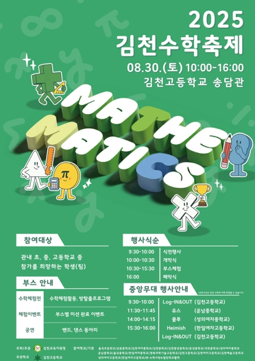 경상북도김천교육지원청은 오는 2025년 8월 30일 오전 10시, 김천고등학교 송담관에서 ‘2025 김천수학축제’를 개최한다. 이번 행사는 김천교육지원청이 주최하고 김천고등학교가 주관학교로 나서서 학생·학부모가 함께 즐길 수 있는 다양한 체험부스와 공연으로 꾸며진다. 축제는 오전 9시 30분 김천고 밴드 Log-IN&OUT의 식전 행사로 시작해, 10시 개막식과 함께 다채로운 프로그램이 본격적으로 펼쳐진다. 행사 중간에는 관내 중·고등학교 밴드 및 댄스 동아리 4개 팀이 무대 공연을 선보이며 축제 분위기를 더욱 고조시킬 예정이다. 올해 수학축제에는 초·중·고 17개 학교가 참여하여 총 25개의 체험 부스를 운영한다. 부스에서는 수학의 개념을 쉽고 재미있게 체험할 수 있는 프로그램이 준비되어 있다. ‘비즈 스트링아트 드림캐처’, ‘오각형 구멍이 있는 종이 세팍타크로공’, ‘십각부메랑’, ‘한붓그리기로 네온사인 만들기’, ‘라틴방진 냄비받침 만들기’처럼 창의적인 공예 체험부터, ‘퍼즐탐험’, ‘방탈출 보드게임’, ‘보드게임 속 수학’, ‘유닛퍼즐’, ‘메타와이어퍼즐’과 같은 두뇌 게임, 그리고 ‘테셀레이션 텀블러 만들기’, ‘텐세그리티 구조물 만들기’ 등 과학적 원리가 담긴 메이커 활동까지 다채롭게 마련됐다. 또 김천고등학교 학생들이 운영하는 의료 부스와, 수학사랑이 운영하는 ‘똑똑 주식대결 & 똑똑 도시설계’ 부스도 많은 관심을 모을 것으로 기대된다. 이번 2025 김천수학축제는 교과서 속의 수학에서 벗어나 놀이와 예술을 통해 함께 즐길 수 있는 자리라는 점에서 의미가 크다. 학생들은 다양한 체험을 통해 창의적 사고와 문제해결력을 기르고 수학에 대한 흥미와 자신감을 얻을 것으로 기대된다. 김천교육지원청 모태화 교육장은 “이번 수학축제는 학생들이 주인공이 되어 즐기고 배우는 소중한 경험의 자리”라며, “수학이 어렵고 딱딱한 학문이 아니라 생활 속에서 흥미롭게 활용될 수 있다는 것을 느끼길 바란다. 앞으로도 학생 중심의 창의융합형 교육 활동을 적극 지원하겠다.”고 말했다.