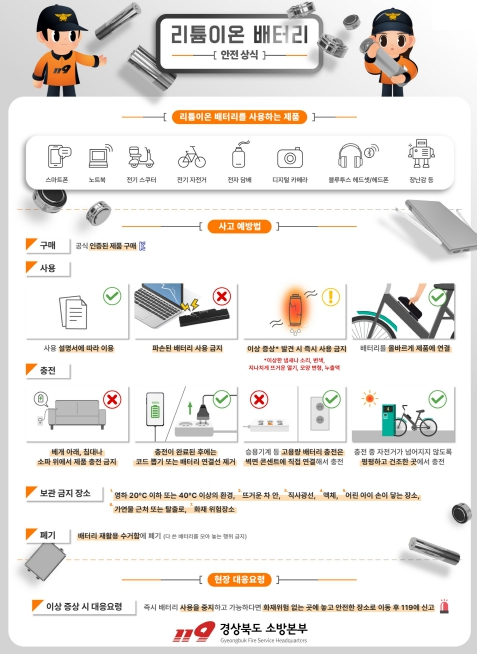 경북소방본부는 최근 전동킥보드 등 개인형 이동장치(PM)의 실내 충전 과정에서 화재 사고가 잇따라 발생함에 따라 주의를 당부했다.경북소방본부는 최근 3년간(2022.7.1.~2025.6.30.) 도내에서 배터리 관련 화재가 총 74건 발생했으며, 주요 원인은 과충전(25.7%), 미확인 단락(13.5%), 화학적 요인 발화(9.5%), 기타 요인(51.3%)으로 분석했다.실제 지난해 11월 경북 ○○시의 한 아파트에서는 배터리를 충전하는 중 폭발과 함께 화재가 발생해 주민들이 긴급 대피했으며, 300여만 원의 재산 피해가 발생했다. 또한 최근 서울의 한 아파트에서는 전동킥보드 충전 중 폭발로 불이 나 2명이 숨지는 인명피해도 있었다.소방본부는 배터리 화재 대부분이 충전 과정에서 발생한다며, 현관 등 출입구 근처 충전 금지, 과충전 방지, 충전 중 주변 가연물 정리, 정품 충전기 사용, 배터리 손상 시 즉시 사용 중단 등 다섯 가지 안전수칙을 반드시 지켜야 한다고 강조했다.박성열 경북소방본부장은 “전동킥보드는 생활편의를 돕는 유용한 이동수단이지만 안전수칙을 지키지 않으면 대형화재로 이어질 수 있다”며 “작은 실천이 곧 나와 가족의 안전을 지키는 길임을 명심해야 한다”고 말했다.
