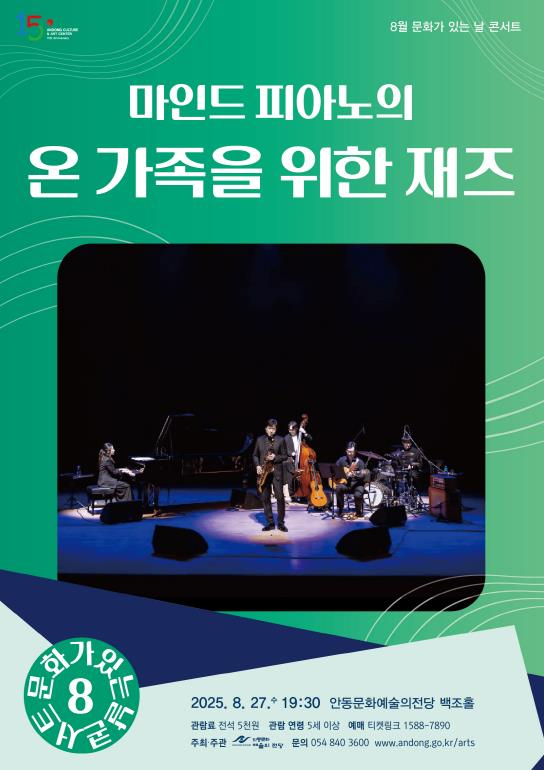 안동문화예술의전당은 일반인들이 더욱 쉽게 문화를 일상에서 즐길 수 있도록, 매달 마지막 수요일을 ‘문화가 있는 날’로 지정해 생활 속 문화 향유를 확산하기 위한 다양한 상설 프로그램을 진행하고 있다.8월 문화가 있는 날 콘서트 ‘마인드 피아노의 온 가족을 위한 재즈’가 8월 27일 저녁 7시 30분 백조홀에서 열린다.마인드 피아노는 14만 명의 유튜브 구독자를 보유한 유명 공연단체로, 다양한 장르의 재즈 음악을 선보이며 널리 사랑받고 있다. 특히, 젊은 세대에게 재즈의 매력을 알리는 데 크게 기여하고 있으며, 동시에 가족과 함께 즐기는 가족 콘서트의 주역으로서 주목받고 있는 공연단체다.이번 콘서트의 프로그램은 마인드 피아노의 특색을 살린 다채로운 재즈 음악으로, 누구나 좋아하는 곡들을 편하게 감상할 수 있도록 클래식 재즈부터 가요, 팝까지 오랜 시간 동안 사랑받아 온 곡들을 선정했다. 무더운 여름, 화려한 피아노 재즈로 온 가족에게 즐거움과 힐링을 선사하는 공연이 될 것이다.