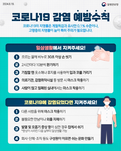 경산시는 전국적으로 코로나19 입원환자 수가 최근 6주 연속 증가함에 따라 코로나19를 포함한 호흡기 감염병의 확산을 방지하기 위해 시민들에게 철저한 예방 수칙 준수를 당부했다.특히, 코로나19 입원환자 중 65세 이상 고령층이 59.8%(8.3.~8.9.)를 차지하며 5주 연속 증가했고 현재까지의 코로나19 발생 동향과 예년 여름철 유행 양상을 고려할 때 향후 2주간은 증가추세가 지속될 가능성이 있어 고위험군 보호를 위한 일상 속 감염 예방 수칙 실천이 필요하다.예방 수칙으로는 ▲흐르는 물에 비누로 손 씻기 ▲실내 자주 환기하기 ▲기침할 때 옷소매나 휴지로 입과 코 가리기 ▲의료기관 및 감염 취약 시설 방문 시 마스크 착용 ▲고령층이나 면역저하자 등 고위험군은 사람이 많고 밀폐된 실내 행사 참여를 자제하고, 부득이한 경우에는 마스크 착용을 권장 ▲발열·기침 등 호흡기 증상이 있을 경우 외출을 자제하고 신속히 진료를 받아야 한다.안병숙 보건소장은 “고위험군이 많이 이용하는 감염 취약 시설에서는 종사자·보호자·방문자 모두 마스크를 착용하고 호흡기 감염 예방 수칙을 강화해 달라”고 당부하며, “경산시보건소는 코로나19 발생 동향을 지속적으로 모니터링하고, 감염 취약 시설에 대한 집중 감시와 신속한 대응체계를 유지하여 지역 사회 건강을 지키는 데 최선을 다하겠다”고 밝혔다.