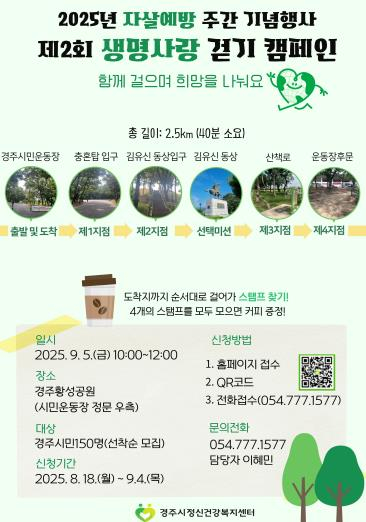 경주시는 세계자살예방의 날을 맞아 오는 9월 5일 오전 10시부터 12시까지 황성공원 일대에서 ‘제2회 생명사랑 걷기 캠페인’을 개최한다고 밝혔다.이번 캠페인에는 경주시민 150여 명이 함께해 생명의 소중함을 되새기고 생명존중 문화를 확산하는 뜻깊은 시간을 갖는다.참가자들은 시민운동장 정문 우측에서 출발해 황성공원 산책로 2.5㎞를 약 40분간 걷는다.걷기 과정에서 자살예방 OX퀴즈, 빈칸 맞추기, 스트레스 총쏘기, 서약서 쓰기 등 다양한 체험 프로그램도 진행되며, 행사 참여를 마친 시민들에게는 기념품이 제공된다.참가비는 무료이며, 신청은 9월5일까지 가능하다. 접수는 경주시정신건강복지센터 홈페이지와 전화, 또는 QR코드를 통해 할 수 있다.박재홍 경주시정신건강복지센터장은 “걷기를 통해 시민 모두가 생명의 소중함을 다시금 느끼고 서로에게 힘이 되는 시간이 되길 바란다”고 말했다.