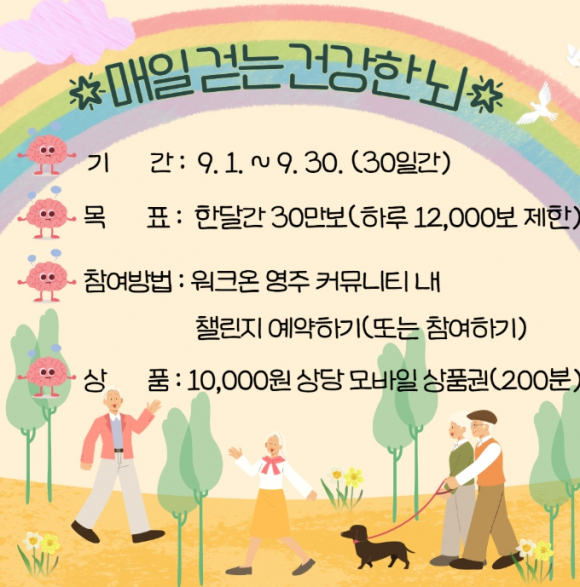 영주시보건소는 시민의 건강한 삶과 치매 예방을 위해 9월 1일부터 9월 30일까지 한 달간, 모바일 걷기 앱 ‘워크온(WalkOn)’을 활용한 ‘치매예방 걷기 챌린지’를 운영한다고 밝혔다.이번 챌린지는 총 30만보 걷기를 목표로 하며, 1일 최대 1만 2천보까지만 인정된다. 목표 달성자 중 무작위로 200명을 추첨해 소정의 상품이 제공될 예정이다.참여를 희망하는 시민은 스마트폰에서 ‘워크온’ 앱을 설치하고 회원가입 후, ‘영주시 공식 커뮤니티’에 가입해 챌린지 화면에서 [참여하기] 버튼을 누른 뒤, 기간 내 목표 걸음 수를 달성할 수 있도록 일상 속에서 꾸준히 걷기 운동을 실천하면 된다.영주시는 걷기 운동과 함께 치매 조기 발견 및 예방을 위한 정책도 함께 펼치고 있다. 영주시 치매안심센터에서는 만 60세 이상 시민을 대상으로 무료 치매 선별검사를 상시 운영하고 있으며, 필요시 정밀검사와 상담 연계도 가능하다.시는 걷기 챌린지 참여와 함께 검진까지 병행한다면 보다 효과적인 치매 예방 활동이 될 것으로 기대하고 있다.영주시보건소 관계자는 “이번 걷기 챌린지를 통해 시민들이 일상속에서 즐겁게 걷기를 실천하고, 치매 예방을 위한 생활 습관이 시민들에게 자연스럽게 스며들 수 있기를 바란다”고 말했다.걷기 챌린지와 관련한 자세한 사항은 보건소 건강증진과로 문의하면 된다.