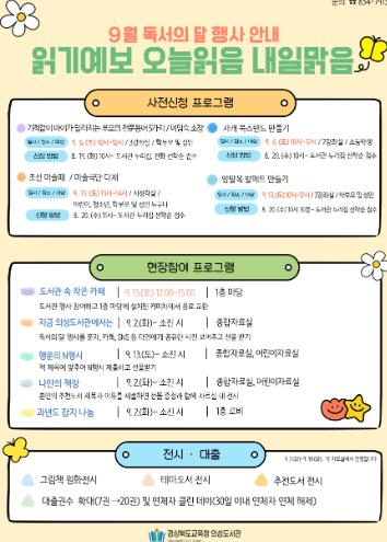 경상북도교육청 의성도서관은 9월 2일부터 `독서의 달`을 맞이하여 ‘읽기예보: 오늘읽음, 내일맑음’표어 아래 다양한 행사를 진행한다. 이번 행사는 강연, 공연, 체험 및 이벤트 등 어린이, 청소년, 학부모 및 성인 모두가 참여할 수 있는 15개 프로그램을 운영하며 생활 속에서 책과 도서관을 더 가까이 접할 수 있는 기회가 될 것이다. 주요 프로그램으로 ▲한국적 무용과 마술이 함께하는 ‘조선 마술패’ 공연 ▲어린이 대상 ‘자개 북스탠드 만들기’ ▲학부모 및 성인 대상 ‘양말목 발매트 만들기’ ▲이용자 대상 커피차 ‘도서관 속 작은 카페’ ▲ 이용자의 추천도서로 꾸미는‘나만의 책장’ 등을 운영한다. 이미경 관장은 “9월 독서의 달 행사를 통해 의성지역의 모든 세대가 도서관에서 책과 소통하고 풍성한 문화 경험의 기회를 얻기 바란다.”라고 전했다. 기타 궁금한 사항은 경상북도교육청 의성도서관으로 문의하거나 홈페이지를 참고하면 된다.