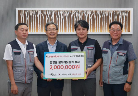 (주)케이티 서비스 남부 대구본부 안동지사 김현승 안동지사장과 이종표 대구본부 노조지부장은 26일 영양군청을 방문해 지역의 어려운 이웃과 희망을 나누고자 성금 200만원을 전달했다. 이번 기부는 ‘노사랑 희망나눔 서비스’라는 2025년 슬로건 아래 전 임직원과 노동조합이 뜻을 모아 마련됐으며, 경기 침체와 고물가 등으로 생활에 어려움을 겪는 복지 사각지대 이웃들을 지원하는 데 사용될 예정이다. 김현승 안동지사장은 “기업의 성장과 지역사회 발전은 함께 가야 한다는 믿음으로 이번 기부에 동참하게 됐다”며, “비록 작은 정성이지만 꼭 필요한 이웃들에게 잘 전달되길 바란다”고 말했다. 오도창 영양군수는 “따뜻한 마음으로 정성을 모아주신 (주)케이티 서비스남부 대구본부 안동지사 임직원과 노동조합 여러분께 깊이 감사드린다”며, “여러분의 소중한 나눔은 어려움 속에서도 희망을 잃지 않도록 이웃들에게 큰 힘과 위로가 될 것”이라고 전했다.