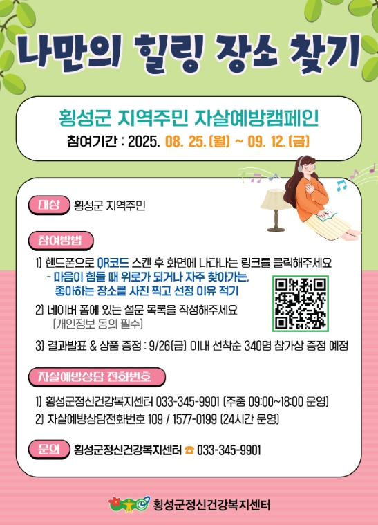 횡성군정신건강복지센터는 세계 자살예방의 날(9월 10일)을 맞아 군민의 생명 존중 의식을 확산하기 위해 온·오프라인 자살예방 캠페인을 진행한다고 27일 밝혔다.온라인 캠페인은 8월 25일부터 9월 12일까지 진행된다. 참여를 원하는 주민은 포스터 및 SNS(인스타그램)에 게시된 QR코드를 통해 참여 가능하다. “나만의 힐링 장소 찾기”를 주제로 마음이 힘들거나 위로가 필요할 때 자주 찾아가는 장소의 사진을 찍고 선정이유를 제출하면 되며, 선착순 340명에게는 기념품이 증정된다.오프라인 캠페인은 9월 1일 오전 10시부터 12시까지 만세공원에서 열릴 예정이다. △생명 존중과 마음 건강에 대한 주민 홍보와 홍보물 배부 △24시간 자살예방 상담전화(109번) 홍보 △자살예방 관련 OX 퀴즈 등을 통해 주민들의 참여를 이끌고, 생명 존중 문화 확산에 나설 예정이다.서준호 센터장은 “이번 캠페인을 통해 자살 문제의 심각성과 위험 요인을 알리고, 자살예방 정보를 제공함으로써 지역 내 자살률 감소에 기여하길 기대한다”고 말했다.횡성군민이라면 횡성군정신건강복지센터에서 상담 예약 후 정신건강상담 서비스를 받을 수 있으며 이와 관련한 문의는 로 연락하면 된다. 힘들고 외로울 때는 언제든지 으로 전화하면 24시간 자살예방상담이 가능하다.
