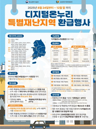 경상북도는 특별재난지역으로 지정된 산불 피해지역 상권 회복과 지역경제 활성화를 위해 ‘디지털 온누리상품권 환급행사’를 24일부터 본격 추진한다.이번 환급행사는 산불 피해로 어려움을 겪는 상인과 주민을 직접 지원하고 침체한 소비심리 회복을 위해, 경북도가 정부 추경에 건의해 시행되는 사업이다.환급행사는 특별재난지역 내 전통시장에서 디지털온누리상품권을 사용해 1만원 이상 물건을 구매한 고객에게 20%를 환급하는 방식으로, 1인당 매주 최대 2만원까지 되돌려 받을 수 있다.따라서 소비자는 디지털온누리상품권 구매 때 10% 할인을 받고, 물건 구매 시 20% 환급을 받아 실질적으로는 30% 할인받게 된다.디지털온누리 상품권은 앱(디지털온누리)을 설치 후 기존 가지고 있는 카드를 등록하고 금액을 충전 후 실물 카드 또는 QR코드 결재 방식으로 이용하는 온누리 상품권을 말한다.행사 기간은 8월 24일부터 12월 말까지이며, 환급 대상 지역은 특별재난지역으로 지정된 안동시, 의성군, 청송군, 영양군, 영덕군, 청도군 26개 전통시장과 상점가이다.경북도는 이번 행사를 통해 디지털온누리상품권 유통 활성화와 함께, 주민이 일상 소비 시 체감할 수 있는 지원 효과를 기대하고 있으며, 특히 전통시장 이용 활성화, 상권 회복, 지역경제 선순환 구조로 이어지는 효과를 극대화한다는 계획이다.경북도는 또한 해당 시장 상인회와 협력해 시장 현장에서 홍보부스 운영, 방문객 안내 등을 지원해 행사 참여를 높일 예정이다.이재훈 경북도 경제통상국장은 “이번 환급행사는 특별재난지역 주민들에게 실질적인 혜택을 제공하고, 산불 피해로 침체한 상권을 회복하는 데 큰 힘이 될 것”이라며, “앞으로도 지역경제 활력을 불어넣기 위한 다양한 소비 촉진 프로그램을 발굴하고, 피해 주민들이 조속히 일상을 회복할 수 있도록 최선을 다하겠다”고 밝혔다.