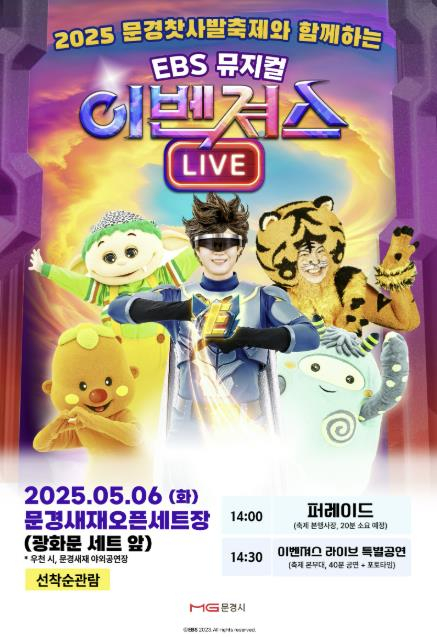 어린이들에게 큰 사랑을 받고 있는 EBS 인기 캐릭터들이 총출동하는 어린이 뮤지컬 [이벤져스]가 오는 5월 6일 오후 2시, 경북 문경새재 오픈세트장에서 특별공연으로 펼쳐진다.이번 공연은 2025 문경찻사발축제와 함께 진행되며, 어린이날을 맞아 가족 단위 관람객들에게 특별한 추억을 선사할 예정이다. 이날 오후 2시부터 문경새재 오픈세트장에서 이벤져스 퍼레이드 공연을 시작으로 오후 2시 30분부터 1시간동안 이벤져스 라이브 특별공연 및 포토타임으로 진행한다.EBS의 대표 캐릭터인 번개맨, 뚝딱이, 방구대장 뿡뿡이, 야호, 뚜앙이 등 이벤져스 캐릭터들이 총출동하여 화려한 퍼포먼스와 흥미진진한 이야기로 무대를 가득 채운다. 아이들의 상상력을 자극하고, 가족 모두가 함께 즐길 수 있는 무대가 될 것으로 기대된다.신현국 문경시장은 “이번 공연은 2025 문경찻사발축제와 어린이날을 기념하여 기획된 특별 이벤트로, 아이들에게 웃음과 감동을 줄 수 있는 무대를 만들고자 준비했다.”며, “EBS와의 협업을 통해 더욱 뜻깊은 자리가 될 것.”이라고 전했다.한편, 본 공연은 별도의 예매 없이 선착순 입장으로 진행되며, 조기 마감이 예상되니 관람을 원하는 가족들은 서두르는 것이 좋다.