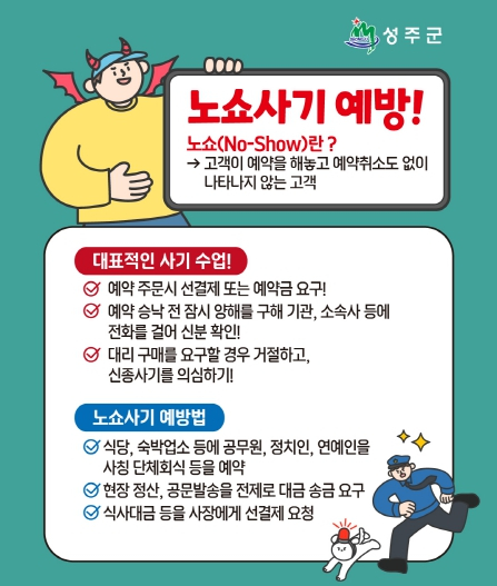 성주군은 민생안전을 위해 관내음식점을 대상으로 최근 급증하는 `단체 예약 부도` (노쇼·No-Show) 피해를 예방하기 위해 정기적인 문자 메시지 홍보를 하고 있다. 이번 조치는 예약 부도로 인해 영업주가 경제적 피해를 입지 않도록 예방하기 위한 것으로, 성주군은 한국외식업중앙회경북지회 성주군지부(지부장 김창원)와 협력하여, 매월 주말 전후 예약 부도 발생 가능성이 높은 시기에 맞춰 안내문자를 발송하고 있다.홍보문자 메시지 내용에는 예약금 결재 요구 및 신분 확인 등 안내, 예약 부도 관련 사기 피해 사례, 신고 방법 등이 포함돼 있다.실제로 지난달 사전 확인을 통해 피해를 예방한 사례도 있다.성주군은 이 외에도 홈페이지, SNS 등을 통해 예약부도 예방홍보 안내문을 게시하고. 의심 사례 발생 시 즉시 경찰(☎112)에 신고해 피해 예방에 도움을 받을 수 있도록 적극적으로 대응하고 있다.보건소관계자는 ˝예약 부도는 소상공인에게 큰 피해를 주는 심각한 문제˝라며 ˝시민의 인식 개선과 지속적인 홍보를 통해 건전한 예약 문화가 정착될 수 있도록 최선을 다하겠다˝고 말했다.