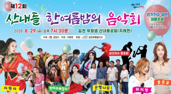 김천시가 주최하고 지례면과 지례면 주민자치위원회가 공동 주관하는`제12회 산내들 한여름 밤의 음악회`가 오는 8월 29일 오후 7시 30분 산내들 공원 야외공연장에서 개최된다. 올해로 제12회를 맞이하는 산내들 한여름 밤의 음악회에서는 무더운 여름, 시민들이 함께 어울려 음악으로 소통하고 힐링할 수 있는 다양한 공연이 개최된다. 삼산이수 색소폰 동호회, 김천시립국악단과 가야금 공연, 그룹사운드 은행나무, 가수 최지현, 딴따라 패밀리, 가수 지원이의 열정적이고 감동적인 무대가 펼쳐질 예정이다. 또한, 행사 중간중간 다양한 경품 추첨이 진행될 예정이며, 한국수자원공사 김천부항댐지사에서도 본 행사의 성공적인 개최를 위해 적극적인 지원을 한다. 관계자는 “별빛 가득한 아름다운 여름밤, 자연과 음악이 어우러지는 산내들 한여름 밤의 음악회에서 사랑하는 가족 및 이웃들과 함께 감동과 여운이 가득한 특별한 시간을 누리시길 바란다.”라고 전했다.