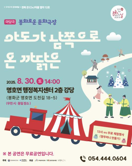 봉화군은 오는 8월 30일 오후 1시부터 명호면 행정복지센터 2층 강당(명호면 도천길 18-5)에서 ‘봉화로운 문화극장’ 행사를 개최한다. 이번 행사는 체험 프로그램과 공연으로 구성되며, 군민 누구나 무료로 참여할 수 있다.오후 1시부터는 전통 공예 체험인 향주머니 만들기 프로그램이 운영되고, 이어 오후 2시부터는 마당극 ‘아도가 남쪽으로 온 까닭은’ 공연이 펼쳐질 예정이다.해당 공연은 고마나루연극제 은상, 한국연극협회 베스트 작품상 등을 수상한 작품으로, 2019년부터 전국 각지에서 20회 이상 공연되며 작품성을 인정받아왔다.이번 사업은 문화체육관광부와 경상북도가 주최하고, 경북문화재단과 지역문화진흥원, (사)문화창작집단 공터다가 주관하는 2025년 문화가 있는 날 ‘봉화로운 문화극장’ 사업의 일환으로 진행된다.‘문화가 있는 날’은 문화기본법 제12조 2항에 근거해 국민이 일상 속에서 문화를 쉽게 접할 수 있도록 매달 마지막 수요일(해당 주간 포함)에 다양한 문화 혜택을 제공하는 제도다.(사)문화창작집단 공터다는 문화환경이 열악한 지역 주민들의 문화 향유권을 높이기 위해 6월부터 11월까지 군 전역을 순회하며 공연배달 서비스를 진행하고 있다. 특히 인구소멸 및 고령화 지역을 중심으로 문화예술의 사회적 가치를 실현하고자 노력하고 있다.앞서 7월에는 소천면에서 공연이 진행됐으며, 관람객들은 “이런 공연은 처음 본다. 함께 박수치며 즐기다 보니 시간 가는 줄 몰랐다. 향주머니 만들기 체험도 인상 깊었다.”는 등의 호평을 전했다.