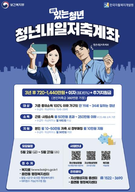 예천군은 일하는 저소득 청년들의 자립을 지원하기 위한 ‘2025년 청년내일저축계좌’ 신규 가입자를 5월 2일부터 21일까지 모집한다고 밝혔다.‘자산형성 지원사업’의 일환으로 추진되는 청년내일저축계좌는 연령·가구소득·본인소득 요건을 갖춘 청년이 3년간 월 10만 원 이상 꾸준히 저축하면 정부가 소득계층에 따라 월 10~30만 원의 근로소득장려금을 추가 적립하여 만기 시 최대 1,440만 원을 수령할 수 있도록 지원하는 제도이다.신청 대상은 만 19~34세 이하 근로·사업소득이 있는 기준중위소득 100% 이하 월 소득 50만 원 초과~250만 원 이하 청년이며, 기준중위소득 50% 이하인 경우 만 15~39세까지, 월 소득 10만 원 이상이면 가입 가능하다.가입 희망자는 신분증과 소득증빙서류 등을 지참하여 주민등록상 거주지 읍·면 행정복지센터에 방문 신청 또는 복지포털 사이트 ‘복지로’를 통해 온라인 신청할 수 있다.청년도약계좌나 청년희망적금 가입자도 신청 가능하며, 가구 소득·재산 조사를 거쳐 오는 8월 최종 대상자를 선정한다.만기 시 정부지원금을 받기 위해서는 3년간 꾸준한 근로 활동과 본인적립금 납입, 자립역량교육 10시간 이수 등의 요건을 충족해야 하며, 자세한 사항은 예천군청 누리집 공지사항과 자산형성포털을 참고하거나 자산형성지원 콜센터로 문의하면 된다.김학동 군수는 “청년내일저축계좌는 일하는 청년이 목돈을 마련하여 미래를 준비할 수 있도록 돕는 실효성있는 제도”라며 “지역 청년들의 많은 관심과 참여를 바란다”고 전했다.