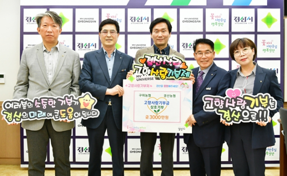 경산시는 29일 경산시청에서 경산시 농협(지부장 이재근)과 구미시 농협(지부장 이승철) 직원들이 고향사랑기부금 상호기부를 통해 서로의 지역을 응원하는 뜻깊은 행사를 가졌다고 밝혔다.이날 기탁식에는 이재근 농협중앙회 경산시지부장과 경산시 9개 농축협 대표로 손병한 자인농협조합장, 이승철 농협중앙회 구미시지부장, 구미시 8개 농축협 대표로 김택동 동구미농협조합장, 정찬우 구미시지부 농정지원단장 등이 참석했다. 이번 행사는 지난 24일 경산시 농협 임직원들이 구미시를 방문해 기부한 데 이어, 구미 농협 관계자들이 경산시를 찾아 3,000만 원을 기부하며 이어졌다.이재근 경산농협 지부장은 “이번 상호기부 행사는 경산농협과 구미농협 직원 간 우정과 협력의 결실”이라며 “단순한 기부를 넘어 각 농협 간 협력기반을 다지고, 서로의 특산물 홍보를 통한 지역경제 활성화에도 기여할 것으로 기대한다”고 말했다.조현일 경산시장은 “최근 기후변화와 가격 불확실성 등으로 농업 경영이 더욱 어려워지는 상황에서, 경산농협과 구미농협이 고향사랑기부제를 통해 농업 지원과 지역 상생을 위한 협력 증진을 도모하는 좋은 모델이 되길 바란다”고 밝혔다.