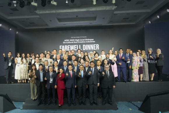 경주시는 2025 APEC 문화산업고위급대화 환송만찬이 경북과 경주의 전통 문화와 예술, 그리고 환대의 정신을 각국 대표단과 공유하는 뜻 깊은 문화외교의 장으로 펼쳐졌다고 밝혔다. 경상북도와 경주시가 APEC 개최도시로서 주최한 문화산업고위급대화 환송만찬이 27일 저녁 경주 라한호텔 컨벤션홀에서 성대하게 열렸다.이 자리에는 최휘영 문화체육관광부 장관을 비롯한 APEC 회원경제 수석대표단, 이철우 경북도지사, 주낙영 경주시장, 최병준 경북도의회 직무대리 부의장, 이동협 경주시의장, 허민 국가유산청장 등 130여명이 참석했으며, 민간에서는 박몽룡, 이상걸 APEC 범시도민지원협의회 공동회장이 시민을 대표해 동참함으로써 환대의 의미를 더했다.만찬행사에 앞서 컨벤션홀 전실에서 열린 칵테일 리셉션에서는 경북과 경주의 대표 술인 교동법주(경주교동법주), 대몽재1779(경주교촌도가), 안동소주(명인안동소주), 크라테 미디엄 드라이(수도산와이너리) 등 미리 맛보는 정상 만찬주 코너가 운영되어 참가단으로부터 큰 호응을 얻었다.또한 리셉션장 곳곳에는 전통 한복을 입은 운영요원이 대표단을 안내하고, 황금의 도시 신라의 정밀한 금속공예를 대표하는 선각단화쌍조문 금박과 경상북도 무형유산 김선식 사기장의 생활자기 식기세트가 전시되어 한국 전통 문화와 예술의 멋을 알렸다.만찬행사는 성덕대왕 신종을 모티브로 3,650개의 스피커를 활용해 현대적으로 재현한 현영(대종)의 울림있는 종소리와 함께 문화산업분야 회원 수석대표단에게 특별 기념품을 전달함으로써 이번 행사의 뜻 깊은 의미를 전했다.경상북도는 불국사의 아름다움을 프리미엄 강판 위에 형상화한 철강 ‘스틸아트’ 작품을 청송 산불 피해목을 활용해 준비했으며, 경주시는 한국적 정서와 경주의 대표 이미지를 잘 살린 소산 박대성 화백의 작품 ‘삼릉비경’을 APEC 특별 판화 에디션으로 제작해 전달했다.식후 공연으로는 세계태권도연맹 시범단이 박진감 넘치는 퍼포먼스를 선보였으며, APEC 21개 회원국 출신 유학생들로 구성된 다국적 합창단과 어린이 합창단이 함께 무대에 올라 우정과 화합의 메시지를 전하며 만찬의 대미를 장식했다.이철우 도지사는 “최초의 APEC 문화산업고위급대화가 이곳, 한류의 뿌리인 경주에서 열리게 된 것은 매우 뜻 깊은 일이다”면서“K-컬쳐의 세계적 가치와 경제협력 강화뿐만 아니라 세계 평화를 위해 오는 10월 APEC 정상회의가 역대 가장 성공적인 APEC이 되도록 최선을 다 하겠다”고 했다.주낙영 경주시장은 “오래된 미래도시 경주를 로마와 파리와 같은 세계적인 도시로 만드는 것이 오랜 꿈이자 이상이었다.”고 밝히며, “올 가을 경주에서 APEC 정상회의가 열린다는 사실만으로도 이 꿈의 절반은 이룬 것 같다.”고 전했다.이어 “이번 문화산업고위급대화는 경주의 역사문화적 가치와 미래 비전을 아시아태평양지역과 공유하는 뜻 깊은 자리였다.”며, “이번 APEC을 통해 경주가 찬란한 과거에 머무르지 않고 새로운 미래로 나아가는 일대 전환점이 될 수 있도록 최선을 다해 준비하겠다.”고 말했다.