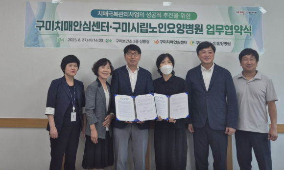 구미치매안심센터는 지난 27일 구미보건소 상황실에서 구미시립노인요양병원과 치매극복 관리사업의 원활한 추진을 위한 업무협약(MOU)을 체결했다.이번 협약으로 두 기관은 △치매 조기발견 및 등록 연계 △환자와 가족 지원 서비스 협력 △예방·조기검진·인식개선 활동 공동 추진 △치매 관련 교육 확대 등 지역사회 치매극복을 위한 다양한 사업을 함께 펼치게 된다.특히 구미시립노인요양병원은 입·퇴원 치매환자를 치매안심센터와 신속히 연계해 조기등록을 강화한다. 이를 통해 환자와 가족은 보다 안정적인 돌봄 체계를 제공받을 수 있으며, 퇴원 후 일상생활 복귀와 재입원 방지에도 도움이 될 것으로 기대된다.임명섭 구미보건소장은 “이번 협약은 치매환자 등록과 서비스 연계에 큰 힘이 될 것”이라며 “구미시가 치매친화적 지역사회로 나아가는 중요한 디딤돌이 될 것”이라고 강조했다.현재 구미치매안심센터는 상담 및 등록 지원은 물론, 치매치료관리비 지원, 조호물품(기저귀) 제공, 배회인식표와 지문등록, 쉼터 프로그램 운영 등 맞춤형 서비스를 운영하며 시민의 치매 예방과 돌봄 공백 해소에 힘쓰고 있다.
