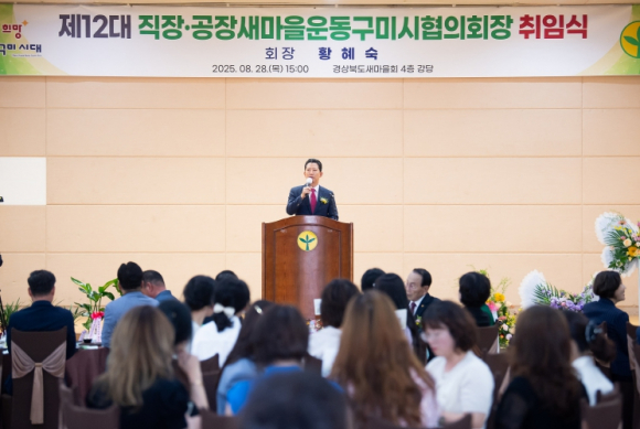 구미시는 8월 28일 경상북도새마을회관 4층 강당에서 ‘제12대 직장·공장새마을운동구미시협의회장 취임식’을 열었다. 이날 행사에는 김장호 구미시장을 비롯해 새마을단체장과 관내 기관·단체장 등 100여 명이 참석했다.취임식은 신임 회장 인준서 수여, 새마을조끼·배지 전달, 직장·공장새마을운동 기(旗) 이양, 새마을 노래 제창 순으로 진행됐다. 참석자들은 화합과 축하의 분위기 속에서 협의회의 새 출발을 함께했다.신임 황혜숙 회장은 구미시체육회 이사이자 백우정 대표로 활동하고 있으며, 국제로타리 3630지구 19지역 회장 등을 역임하며 다양한 분야에서 리더십을 발휘해왔다. 황 회장은 취임사에서 “근면·자조·협동의 새마을 정신을 바탕으로 직장문화 혁신과 지역 공동체 의식 강화를 위해 최선을 다하겠다”고 말했다.김장호 구미시장은 축사를 통해 “황혜숙 회장님의 취임을 진심으로 축하드리며, 직장·공장새마을운동이 일터와 지역사회를 잇는 가교로서 구미 산업 발전과 시민 화합에 크게 기여해 주시기를 기대한다”고 전했다.직장·공장새마을운동구미시협의회는 현재 68개 회원사로 구성돼 있으며, ‘행복 더하기 사랑나눔 물품 전달’, ‘국가유공자 백년장수사진 촬영’ 등 다양한 나눔 활동을 펼치고 있다.