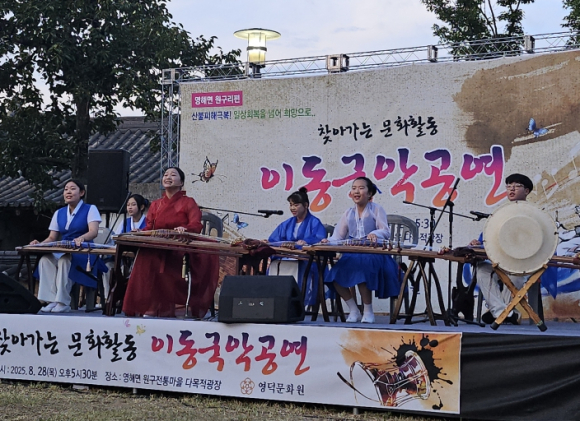 영덕문화원(원장 김두기)은 지난 28일 영해면 원구전통마을 다목적 광장에서 ‘찾아가는 문화활동’ 이동 국악공연을 개최했다.‘찾아가는 문화활동’은 문화생활 향유가 어려운 군내 문화 소외계층을 포함한 군민들을 위해 다양한 지역을 찾아가는 국악 공연으로, 군민들의 삶의 질 향상과 문화예술 향유 기회를 제공하기 위해 추진되고 있다.이번 공연은 특히 최근 산불로 어려움을 겪은 지역 주민들을 위로하고, 헌신적으로 도움을 준 공무원과 자원봉사자들에게 감사의 뜻을 전하며, 영덕군민들에게 희망과 용기를 전달하기 위해 마련됐다.
