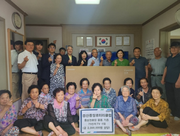 경산중앙로타리클럽(회장 박동근)은 28일 중삼경로당(회장 허창옥)에 75인치 TV(200만 원 상당)를 기증했다. 이번 기증은 어르신들이 함께 모여 소통하고 즐길 수 있는 공간을 더욱 풍요롭게 만들고자 하는 마음에서 마련됐으며 어르신들의 일상에 작은 즐거움과 활력이 더해질 것으로 기대된다.박동근 경산중앙로타리클럽 회장은 “작은 정성이지만 어르신들께서 밝고 행복한 시간을 보내시길 바라는 마음으로 준비했다”며 “앞으로도 지역사회의 따뜻한 동행자로서 나눔을 이어가겠다”고 말했다.허창옥 중삼경로당 회장은 “경로 회원이 함께 모여 웃고 즐길 수 있는 귀한 시간이 더 많아질 것 같아 마음이 따뜻해진다˝며 “큰 선물을 전해주신 경산중앙로타리클럽에 진심으로 감사드린다”고 전했다.이남진 중앙동장은 “이번 기증은 어르신들의 행복과 소통을 위한 의미 있는 나눔”이라며 “경산중앙로타리클럽의 지속적인 봉사에 감사드리며, 행정복지센터도 민간단체와 협력해 어르신들의 생활환경 개선에 힘쓰겠다”고 밝혔다.한편, 경산중앙로타리클럽은 매년 지역 곳곳에서 다양한 봉사와 나눔 활동을 실천하며 이웃과 함께하는 따뜻한 공동체를 만들어가고 있다.