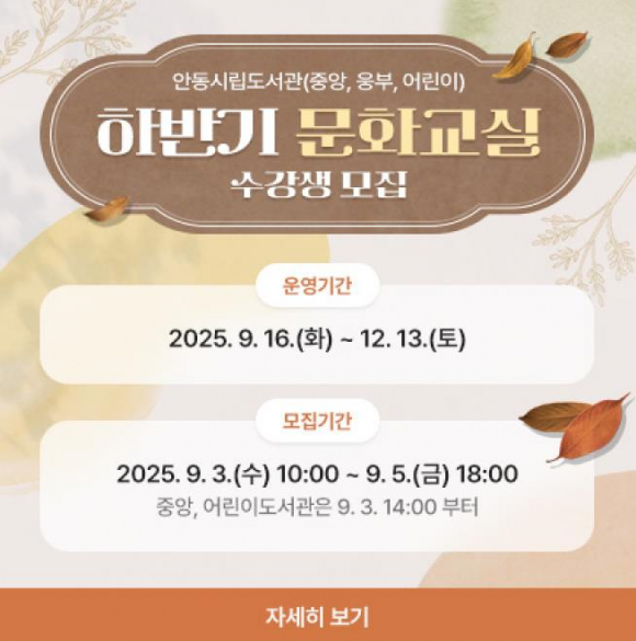 안동시립 웅부도서관은 오는 9월 3일부터 9월 5일까지 하반기 문화교실 수강생 모집한다고 밝혔다.이번 하반기 문화교실은 9월 16일부터 12월 13일까지 12주간 운영될 예정이다. 특히 성인 대상 강좌로 ▲원어민과 함께하는 영어 ▲타로카드 배우기(초급, 심화) ▲캘리그라피(초급, 심화) ▲채색이 있는 연필드로잉 ▲오일파스텔 배우기 ▲왕초보 손뜨개 ▲자세교정 필라테스가 진행되고, 유치/초등 대상으로 ▲영화와 한국사 여행 ▲창의융합 독서토론 논술 ▲키 크는 요가가 열린다.수강 신청은 안동 시민 누구나 가능하며, 안동시립도서관 누리집에서 선착순으로 신청할 수 있고 수강료는 무료다.안동시립도서관장은 “하반기 문화교실을 통해 더 많은 주민이 다양한 문화적 경험과 자기계발의 기회를 누리길 바라며, 앞으로 다양하고 유익한 강좌를 지속적으로 개설하도록 노력하겠다”고 전했다.