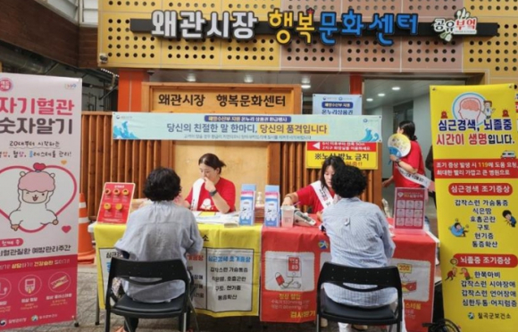 칠곡군은 오는 9월 1일부터 7일까지 심뇌혈관질환 예방관리주간을 맞이하여 군민들에게 심뇌혈관질환에 대한 중요성을 알리기 위해‘자기혈관 숫자알기’레드서클 캠페인을 실시한다.레드서클 캠페인은 자신의 혈압·혈당·콜레스테롤 수치를 알고 만성질환을 관리하여 심뇌혈관질환을 예방하자는 취지이다.9월 한달동안 사업장, 왜관시장 행복문화센터, 약목시장, 지천면사무소 등에서 혈압·혈당 측정 및 건강상담, 심뇌혈관질환 예방관리 9대 수칙 안내, 심근경색·뇌졸중 조기증상 및 대처법 O,X퀴즈 풀기, 피켓 홍보활동 등을 진행한다. 또 홈페이지, 전광판, SNS를 활용한 온라인 홍보를 진행하며 8일부터 3주간 워크온 앱을 활용해‘레드서클 걷기 챌린지’를 실시, 13만보 걷기 미션을 완료한 사람 대상으로 추첨을 통해 상품을 제공한다.