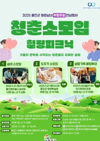 울진군은 미혼 남녀들의 특별한 만남 행사인‘청춘동아리 소모임 및 피크닉 매칭투어’를 지난 봄 시즌에 이어 9월 27일과 28일, 이틀간 개최한다. 이번 행사는 그동안 만남의 기회가 부족했던 청년들을 대상으로, 각자의 개성과 취향을 존중할 수 있는 동아리 소모임 형태로 진행된다. 참가 대상은 경북 거주 또는 소재 기업 재직 중인 미혼 남·여 각 15명씩 총 30명으로 1986~1999년생이다. 참가자들은 동아리 형태의 ▲승마반 ▲도자기 공예반 등 개인 취향존중 활동으로 자연스럽게 교류할 수 있는 시간을 갖게 된다. 마직막 날에는 ▲피크닉 투어가 진행되어 서로를 알아가고 진솔한 만남이 이뤄질 수 있는 기회를 제공할 예정이다. 참가비는 전액 무료이며, 참가 신청은 9월 18일까지 받고, 사전 신청을 통해 선정된 참가자에 한해 행사에 참여할 수 있다. 참가희망자는 군 홈페이지를 참고하여 참가신청서, 재직증명서, 혼인관계증명서, 개인정보 수집·이용동의서를 이메일로 제출하면 된다. 김진국 인구정책과장은“청년들의 눈높이에 맞춘 다양한 프로그램을 통해 자연스러운 만남과 소통이 이뤄지도록 세심하게 준비하겠다”며“앞으로도 지역 청년들이 체감할 수 있는 맞춤형 청년정책을 지속적으로 추진할 것”이라고 말했다.