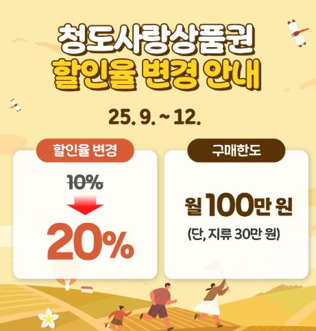 청도군은 지역경제 활성화를 위해 오는 9월 1일부터 연말까지 청도사랑상품권의 할인율을 기존 10%에서 20%로 상향 조종해 할인 판매한다고 밝혔다.이번 할인율 인상조치는 7월 호우피해 특별재난지역 지자체를 대상으로 올해 연말까지 한시 적용되며, 국비를 추가 확보해 20% 할인혜택을 제공할 예정이다. 단, 월 구매한도는 1인당 100만원으로 동일하다. 지류형 청도사랑상품권은 농 · 축협, 새마을금고, 산림조합 등 청도군과 협약을 맺은 21개 금융기관에서 구매할 수 있으며, 카드형은 지역 상품권 전용 앱 “고향사랑페이”를 통해 충전할 수 있다.김하수 청도군수는 “지역사랑상품권은 지역경제에 실질적으로 활력을 불어넣는 시책”이라며 “이번 20% 할인 적용을 통해 호우피해로 위축된 경제를 회복하고 지역 내 소비를 촉진하는 등 지역 경제에 활력을 불어넣을 수 있기를 바란다”고 말했다. 한편 청도군은 청도사랑상품권의 건전하고 투명한 유통을 위해 20% 할인율 상향에 발맞춰 부정유통 단속을 지속적으로 강화할 계획이다.