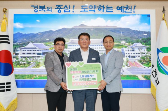 LG유플러스 경북공공고객팀이 1일, 예천군청을 찾아 지역 발전과 주민 복지 증진을 위해 총 300만 원의 고향사랑기부금을 기탁했다. LG유플러스 경북공공고객팀은 대구·경북 지역 지자체 및 공공기관을 대상으로 영업하는 조직으로, 지역사회와의 상생을 중요한 가치로 삼고 다양한 사회적 책임 활동을 이어가고 있다. 특히 2024년부터 꾸준히 고향사랑기부제에 참여하며 예천군에 총 990만 원을 기탁해 기업이 지역사회와 함께 성장하는 모범적인 상생 사례로 평가받고 있다. 이동활 팀장은 “예천군의 발전과 주민 복지를 위해 힘을 보태게 되어 뜻깊게 생각한다”며, “앞으로도 지역과의 긴밀한 협력을 통해 지속가능한 상생 모델을 만들어가겠다”고 밝혔다. 김학동 군수는 “지역사회 발전을 위한 지속적인 응원과 따뜻한 나눔 실적에 깊이 감사드린다”며, “기탁해주신 기부금은 군민 복지와 지역 발전을 위해 소중히 사용하겠다”고 말했다.