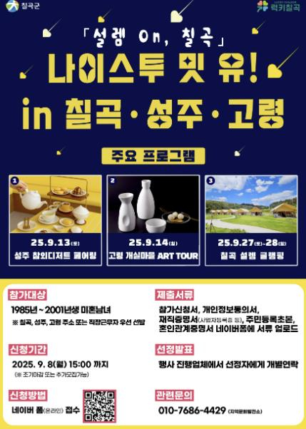 칠곡군은 성주군, 고령군과 함께 공동으로 추진하는 『나이스투밋유! IN 칠곡·성주·고령–설렘On, 칠곡』 미혼남녀 만남 행사를 오는 9월 둘째, 넷째주말 동안 각 군 대표 장소에서 개최한다고 밝혔다.특히 칠곡군은 앞서 상반기에 개최한 『설렘On, 칠곡』 프로그램을 통해 11커플을 매칭(매칭성공률 55%)하는 성과를 거둔 바 있다. 이번 3개 군 통합행사 또한 청춘남녀들의 다양한 만남과 교류의 장이 될 것으로 기대된다.이번 행사는 1985년부터 2001년생까지의 미혼 남녀 60명을 모집하며, 참가자는 3개 군에 주소를 두거나 직장을 둔 사람을 우선 선발한다. 신청은 9월 8일까지 포스터 내 QR코드를 통해 온라인으로 접수할 수 있다.행사 프로그램은 각 군의 특색을 살린 클래스 소모임과 힐링과 즐거움을 모두 만끽할 수 있는 1박2일 글램핑으로 운영된다. (▲9월 13일 성주 ‘참외디저트 페어링’ ▲9월 14일 고령 개실마을 ‘ART TOUR’ ▲9월 27일∼28일 칠곡 ‘설렘 글램핑 캠핑’ 등)칠곡군 관계자는 “이번 행사는 3개 군이 협력하여 준비한 만큼, 청춘남녀들에게는 새로운 만남과 추억을 선물하고, 지역에는 활력과 긍정적인 에너지를 불어넣는 계기가 될 것”이라며 “앞으로도 청년들이 지역에 정착할 수 있도록 다양한 교류·문화 프로그램을 지속적으로 지원하겠다”고 말했다.
