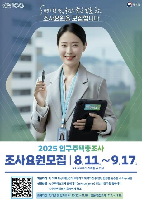 상주시는지난달 11일부터 9월 17일까지 `2025 인구주택총조사`현장조사 업무를 담당할 조사요원을 모집한다.모집 인원은 총 90명이며, 이 중 조사원 80명은 가구 방문 조사를 담당하며, 조사관리자 등은 현장조사가 안전하고 원활하게 진행될 수 있도록 조사 업무를 관리하고 지원하는 업무를 담당하게 된다.모집 대상은 국내에 거주하는 만 18세 이상으로, 인구주택총조사에 관심이 있고 통계조사에 대한 책임감이 있는 분이라면 누구나 지원할 수 있으며, 통계청 인구주택총조사 홈페이지와 기획예산실 방문을 통해 접수할 수 있다.2025 인구주택총조사는 오는 10월 22일부터 11월 18일 기간 동안 실시하며, 표본으로 선정된 가구는 10월 22일부터 인터넷 및 전화조사를 통해 조사원 방문이 시작되기 전에 조사에 참여할 수 있다.11월 1일부터는 조사원이 태블릿PC를 들고 가구 방문 조사를 실시하며, 표본가구에서 인터넷조사 또는 전화조사로 조사에 참여하면 조사원이 가구를 방문하지 않는다.상주시 관계자는 “2025 인구주택총조사의 슬로건이 ‘당신의 답이 대한민국에 좋은 답이 됩니다’”라며, ”국민의 좋은 답을 들어 줄 성실하고 책임감 있는 분들의 많은 지원을 바란다”라고 밝혔다.