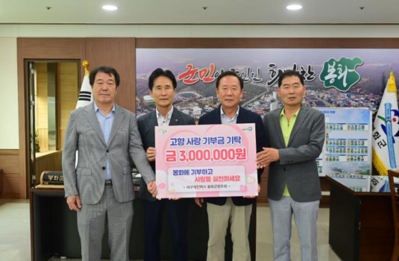 대구개인택시 봉화군향우회는 지난 2일 2년 연속으로 고향사랑기부금 300만원을 기탁했다. 대구개인택시 봉화군향우회는 2017년 창립 이후 현재 100여 명의 회원이 활동하고 있으며, 고향에 깊은 관심과 애정을 가지고 대구지역을 중심으로 봉화의 축제나 행사 등 고향을 널리 알리고 있다.이태영 회장은 “지난해에 이어 올해도 고향에 대한 감사의 마음을 전하고 싶어 기부를 이어가게 됐다”며, “앞으로도 고향에 대한 꾸준한 관심과 고향사랑기부제 활성화에 앞장서겠다”고 말했다.박현국 봉화군수는 “소중한 정성을 2년 연속 보내주셔서 더욱 뜻깊다”며 “기부금은 군민의 복리 증진과 지역 발전을 위해 귀하게 사용하겠다”고 말했다.한편, 고향사랑기부제는 개인이 현재 주소지를 제외한 지자체에 연간 500만원 한도 내에 기부하면 세액공제 혜택과 기부액의 30% 범위에서 답례품을 받을 수 있는 제도이다.