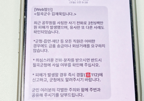 칠곡군이 공무원 사칭 사기 피해 예방을 위해 지난 6월부터 지속적으로 안내와 홍보에 나선 가운데, 최근 실제 피해가 발생하자 긴급 대응에 돌입했다.군에 따르면, 공무원을 사칭해 금품 송금을 요구하는 전화 사기가 발생해 군민이 2천5백만 원의 피해를 입었으며, 이와 유사한 또 다른 사례도 확인됐다. 사기범은“지원사업 물품비 결제”를 빌미로 접근하면서 군 직인이 찍힌 위조 공문서와 가짜 명함까지 제시해 피해자를 속였으며, 송금 후에는 전화번호를 차단하는 등 치밀한 수법을 사용한 것으로 드러났다.칠곡군은 이번 사건 직후 3일 오전 긴급 안내 문자를 발송하고, 군 공식 SNS를 통해 사건 내용을 군민들에게 신속히 알렸다. 문자에는 ▲군청·읍면·재단 등 모든 직원은 어떠한 경우에도 금품 송금이나 외상거래를 요구하지 않는다 ▲의심스러운 전화·문자를 받으면 반드시 칠곡군청에 사실 여부를 확인해야 한다 ▲피해가 발생하면 즉시 경찰(112)에 신고하고, 군청에도 알려야 한다는 주의사항이 담겼다.특히 칠곡군은 지난 6월에도 전국적으로 공무원 사칭 사기 피해가 잇따르자,“공무원은 ▲납품 유도 및 대금 대납 요구 ▲개인 계좌 입금 요청 ▲개인 번호·문자만으로 물품 구매 요청을 절대 하지 않는다”는 내용을 담은 주의 안내 문자를 군민들에게 발송하고, SNS와 마을방송을 통해 지속적으로 홍보해 왔다.아울러 군은 이번 사건을 계기로 칠곡군 주요 거리와 교차로 곳곳에 피해 예방 현수막을 설치해 군민 경각심을 높일 계획이다.김재욱 칠곡군수는“군민의 재산을 지키려면 사기 수법을 신속히 알리고 경각심을 높이는 것이 중요하다”며“문자와 SNS, 마을 방송 등 모든 수단을 동원해 피해를 막고, 소상공인 협회와 협력해 지역 상공인 보호에도 힘쓰겠다. 아울러 군민들께서도 이번 사례를 주변과 공유해 주시길 당부드린다”고 밝혔다.