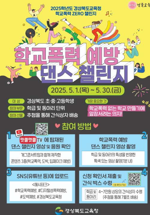 경북교육청은 5월 한 달간 도내 초・중・고등학생들을 대상으로 ‘2025학년도 학교폭력 ZERO 챌린지’를 본격 추진한다고 30일 밝혔다. 이번 챌린지는 ‘학교폭력 없는 따뜻한 경북교육’ 실현을 목표로, 학생들이 수업과 일상에서 자연스럽게 학교폭력의 심각성을 인식하고 주체적으로 예방 활동에 참여할 수 있도록 기획됐다. 특히, 기존의 전달형 학교폭력 예방 교육에서 벗어나, 교육과정과 연계한 체험형 활동을 중심으로 구성됐으며, △학교폭력 예방 댄스 챌린지와 △주먹 대신 주먹밥 캠페인 등 두 가지 프로그램으로 진행된다. ‘학교폭력 예방 댄스 챌린지’는 학급 또는 학생동아리 단위로 참여할 수 있다. 참여를 원하는 학생들은 경상북도교육청 유튜브 채널 ‘맛쿨멋쿨 TV’에 게시된 학교폭력, 디지털 성폭력, 도박 예방을 주제로 한 1분 내외의 숏폼 3종 중 하나를 선택해, 창의적인 댄스 영상을 제작하면 된다. 해당 영상은 경북교육청과 KBS 개그콘서트팀이 협업해 제작한 콘텐츠로, 재미와 교육적 메시지를 동시에 담아 높은 관심을 받고 있다. 우수작은 도 교육청의 홍보 콘텐츠로 활용될 예정이며, 참여 학급과 동아리에는 추첨을 통해 간식 상자가 증정된다. ‘주먹 대신 주먹밥 캠페인’은 도내 초・중・고・특수・각종학교 급식 시간에 주먹밥을 나누며 학교폭력 예방 메시지를 공유하는 실천형 캠페인이다. 각 학교는 5월 중 하루를 자율적으로 정해 운영하며, 주먹밥 배식을 중심으로 학교폭력 예방 포스터 전시와 학생회 주관 캠페인, 어울림교육주간 프로그램 등 다양한 활동과 연계해 진행된다. 이번 캠페인은 학생과 교직원, 학부모 등 학교 구성원 모두가 자발적으로 참여하는 방식을 통해 학교폭력에 대한 공동체의 책임 의식을 높이는 데 중점을 두고 있다. 경북교육청은 ‘2025학년도 학교폭력 ZERO 챌린지’를 통해 학생들이 학교폭력 예방의 중요성을 인식하고, 일상에서 ‘내가 먼저’를 실천할 수 있는 역량을 키워나가는 계기가 되길 기대하고 있다. 임종식 교육감은 “이번 ZERO 챌린지는 교육청이 이끄는 캠페인이 아니라, 학교와 학생이 주체가 되어 만들어가는 실천 중심의 예방 활동”이라며, “폭력이 아닌 존중과 배려가 넘치는 따뜻한 학교문화 조성을 위해 지속적으로 노력하겠다”라고 말했다.