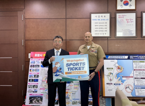 포항시는 21일 시청에서 주한 미 해병대 캠프무적 소속 장병들을 위해 프로야구 관람권 60매를 전달했다.이번 전달은 포항시와 캠프무적 간의 지속적인 우호 관계를 기반으로 추진된 교류 사업의 하나로, 지역사회와 미군 부대 간의 유대 강화를 목적으로 하고 있다. 관람권은 올해 포항에서 열리는 프로야구 3경기에 활용되며, 경기당 무적캠프 해병대원 20명에게 관람이 지원된다. 캠프무적 관계자는 “포항시의 따뜻한 배려에 감사드린다”며, “장병들이 지역사회의 일원으로서 한국 문화를 즐기고 이해하는 데 큰 도움이 될 것”이라고 전했다.장상길 부시장은 “봉사활동과 지역 지원사업 등에 적극적으로 협조해 준 캠프무적에 감사드린다”며, “앞으로도 다양한 교류 프로그램으로 장병들이 포항과 한국 문화를 더욱 가까이에서 체험할 수 있길 바란다”고 말했다.한편 캠프무적은 한반도에 주둔하는 유일한 미 해병대 기지로 1980년에 설립돼 미 해병대의 전략적 전진 배치와 훈련 거점으로 활용되고 있다.