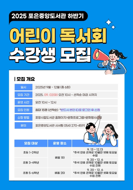 포항시립포은중앙도서관은 ‘2025 하반기 어린이독서회’ 회원을 모집하고 있다. 어린이독서회는 교과 연계 및 우수도서를 활용해 독서 후 토론·글쓰기 등 다양한 독후 활동을 진행하는 프로그램으로, 책을 깊이 있게 이해하고 올바른 독서 습관을 형성할 수 있도록 돕는 도서관 대표 프로그램 중 하나다. 이번 프로그램은 초등 1~2학년, 3~4학년, 5~6학년 각 15명씩 모집하며, 오는 13일부터 12월 13일까지 매주 토요일 오전 10시부터 12시까지 포은중앙도서관 3층 배움1터와 배움2터에서 운영된다. 포항시립도서관 정회원이라면 누구나 무료로 참여할 수 있으며, 자세한 사항은 포항시립도서관 홈페이지 또는 포은중앙도서관 사서팀으로 문의하면 된다. 서양진 시립도서관장은 “독서회는 어린이들의 독서 습관 형성과 시민 교양 함양에 기여하는 의미 있는 프로그램인 만큼 많은 관심과 참여를 바란다”고 말했다.