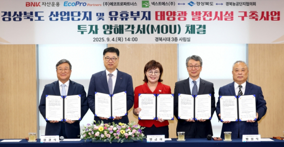 경상북도는 4일 도청에서 BNK자산운용㈜, ㈜에코프로파트너스, 넥스트에스㈜, 경북농공단지협의회와 함께 ‘산업단지 및 유휴부지 태양광 발전시설 구축사업’을 위한 공동협력 및 투자 양해각서(MOU)를 체결했다.협약식에는 양금희 경상북도 경제부지사, 성경식 BNK자산운용㈜ 대표, 방정식 ㈜에코프로파트너스 고문, 손경익 넥스트에스㈜ 대표, 김형구 경북농공단지협의회 회장과 관계자 등 30여 명이 참석해 뜻깊은 자리를 함께했다.이번 사업은 도내 산업단지와 농공단지, 주차장 지붕 등 유휴공간을 활용해 총 300MW 규모의 지붕형 태양광 발전시설을 구축하는 것을 목표로, 2025년부터 2028년까지 3년간 10차에 걸쳐 단계적으로 추진되며 총 5천억 원의 투자가 이루어질 예정이다.특히, 사업을 통해 산업단지의 에너지 자립을 실현해 입주기업의 전력 비용을 절감하고, 지붕 임대료, 발전수익 배당, REC 판매 등 추가 수익과 더불어 양질의 신규 일자리가 창출될 것으로 전망한다.성공적인 사업 추진을 위해 BNK자산운용, 에코프로파트너스는 친환경사업 투자의 전문성을 바탕으로 안정적인 금융 조달 및 펀드 운용을 책임지고, 넥스트에스는 설계·시공·운영 등 사업의 전 과정을 총괄 수행한다. 경북농공단지협의회는 회원 기업의 참여와 협력을 끌어내고, 경상북도는 관계기관 및 시군과 협력체계를 구축해 행정적 지원을 아끼지 않을 예정이다.또한, 다섯 축이 힘을 모아 추진하는 협력 구조는 경상북도가 대한민국 미래 에너지산업 중심지로 자리매김하고, 나아가 세계 경제의 성장축으로 도약할 수 있는 든든한 토대를 마련할 것으로 기대된다.양금희 경상북도 경제부지사는 “경상북도는 경북형 에너지 대전환 계획을 수립하고 이를 적극 실현해 나가고 있다. 이번 협약으로 그 비전을 더 구체화하며, 경상북도와 기업, 산업·농공단지가 앞장서 탄소중립을 실천해 나가게 될 것”이라고 강조했다.이어 “사업을 통해 정부와 세계 에너지 정책에 발맞춰 도내 기업의 경쟁력을 확보하고, 경북을 친환경 에너지 시대를 선도하는 핵심 거점으로 만들어 가겠다”고 밝혔다.