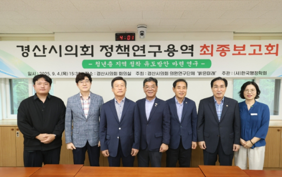 경산시의회 의원연구단체 `밝은미래`는 9월 4일 의회 운영위원회 회의실에서`청년층 지역 정착 유도방안 마련 연구`최종보고회를 가졌다.밝은미래는 양재영, 권중석, 김상호, 전봉근 의원으로 구성되어 있으며, 청년층의 수도권 유출과 지역활력 저하 문제에 대응하고, 경산시에 맞는 생활밀착형 청년 정책을 마련하기 위해 지난 3월 연구용역에 착수했다.이날 보고회에는 소속 의원들과 용역 수행기관 관계자들이 참석한 가운데 진행됐으며, 지난 6개월여간 수행된 연구 결과를 공유하고 정책 대안을 논의하는 자리로 마련됐다.보고회에서는 ▲ 경산시 청년 유출 실태 및 사회‧경제적 영향 분석 ▲ 국내외 청년 정책 우수사례 조사 ▲ 경산형 청년 유입‧정착 모델 및 청년 지구 조성 방안 ▲ 청년친화도시 지정 추진계획 및 조례 정비 방향 등이 중점적으로 발표됐다.특히, 연구진은 “좋은 일자리, 안정된 주거, 풍요로운 문화, 참여 거버넌스라는 4대 축이 유기적으로 맞물릴 때 청년이 머무르고 돌아오는 도시로 나아갈 수 있다.”고 강조했다.밝은미래 의원들은 “이번 최종보고회를 통해 도출된 정책 제안들이 경산시 청년들이 안정적으로 정착하고, 지역 발전의 원동력으로 성장하는 데 실질적으로 기여할 수 있도록 최선을 다하겠다.”고 밝혔다.