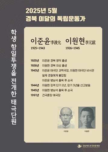 재단법인 경상북도호국보훈재단은 5월의 독립운동가로 1942년 대구에서 조직된 항일학생결사 태극단에서 활동한 독립운동가 이준윤(영덕) 선생과 이원현(의성) 선생을 선정했다. 또한 경북 5월의 독립운동가를 알리기 위해 관계기관 600곳에 포스터를 배부했다.이준윤(李浚允, 1925~1943) 선생은 영덕 출신으로 대구상업학교 재학 중 1943년 4월 태극단에 가입하여 과학국장으로 활동했다. 하지만 같은 해 5월 태극단이 발각되어 체포됐다. 모진 고문을 받고 9월 30일 병보석을 받아 출옥했으나 10월 2일 순국했다.이원현(李元鉉, 1926~1945) 선생은 의성 출신으로 대구상업학교 재학 중 1943년 4월 태극단에 가입하여 비서관으로 활동했다. 마찬가지로 5월 체포되어 1944년 1월 단기 2년, 장기 3년형을 선고받고 옥고를 치르다 1945년 3월 병보석으로 출옥했다. 하지만 고문 후유증으로 같은 해 6월 순국했다. 정부에서는 두 선생의 공훈을 기리어 1991년 건국훈장 애국장을 추서했다.한희원 재단법인 경상북도호국보훈재단 대표이사는“학생들이 보여준 애국심과 희생정신을 기리며, 앞으로도 미래세대가 자주성과 자율 역량을 함양하며 성장할 수 있도록 우리 기관에서도 다양한 프로그램을 개발 하여 교육하고 지원하겠다.”라고 말했다.