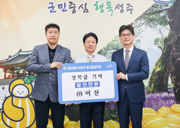 지난 4월 28일 ㈜이산에서 (재)성주군별고을장학회를 찾아 지역인재를 위한 장학금 1천만원을 기탁했다. ㈜이산은 성주군 공공하수도 및 가축분뇨공공처리시설 관리업무를 대행하는 업체로, 내실있는 경영을 통해 성주군의 쾌적한 주거환경에 앞장서고 있다. 2015년부터 매년 장학금을 기탁하여 현재 기탁 누적액은 7천5백만원에 이른다. ㈜이산 김지훈 본부장은 “지역사회로부터 받은 신뢰와 성원에 보답하는 마음으로 장학금을 기탁하게 됐다.”며 “앞으로도 성주군 학생들이 꿈을 잃지 않고 학업에 매진할 수 있도록 장학사업에 꾸준히 동참해 나가겠다.”고 전했다. (재)성주군별고을장학회 관계자는 “지속적인 관심과 나눔에 깊이 감사드린다.”며 “기탁해주신 소중한 뜻을 잘 살려 우리 지역 학생들이 더 큰 꿈을 펼칠 수 있도록 책임감을 갖고 장학사업에 최선을 다하겠다.” 고 전했다.