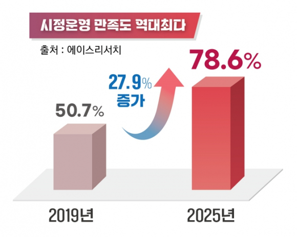 경주시민 10명 중 8명 가까이(78.6%)가 민선 8기 주낙영 경주시장의 시정 운영에 대해 ‘만족한다’고 답한 것으로 나타났다.경주시는 전문 여론조사기관 에이스리서치에 의뢰해 지난 8월 4일부터 11일까지 시민만족도 및 행정수요 조사를 진행했다.이번 조사는 경주에 거주하는 만 18세 이상 남녀 1,008명을 대상으로 대인면접조사 방식으로 이뤄졌으며, 표본 오차는 95% 신뢰수준에서 ±3.1%p다.조사 결과, 시정 운영 만족도는 2019년 50.7%에서 올해 78.6%로 27.9%p 상승하며 역대 최고치를 기록했다. 경주시 발전 가능성에 대해서도 83.4%가 긍정적으로 답해 지난해보다 3.4%p, 2019년 대비 26.4%p 늘었다. 시정활동 인지도 역시 71.0%로 2019년 대비 26%p 높아졌다.분야별 만족도는 △문화·관광·체육(84.3%) △지역개발(80.1%) △일반행정(77.7%) △보건·복지(75.4%) △경제·산업(74.8%) △농림·축산·수산(70.2%) 순으로 나타났다.시민들이 가장 기대하는 사업으로는 △신라왕경 핵심유적 복원·정비(19.7%) △동천~황성 천년숲길 조성(15.6%) △복합문화도서관 및 시립미술관 건립(12.4%) △SMR 국가산단 조성(12.3%) △경주식물원(라원) 조성(10.7%) △경주역세권 해오름 플랫폼 시티(9.2%) 등이 꼽혔다.또한 2025 APEC 정상회의 유치에 대해서는 응답자의 92.1%가 ‘만족한다’고 답했고, 경주 발전에 기여할 것이라는 응답은 92.4%에 달했다.경주시민들은 향후 도시 비전으로 △지역경제 활성화와 일자리 창출(52.8%) △역사문화관광 인프라 확충(23.1%) △보건·복지 강화(7.4%) △교통망 기반의 미래혁신도시(6.4%) 등을 꼽았다.지역경제 활성화를 위한 우선 과제로는 △청년 창업 및 일자리 지원(30.2%) △기업 투자유치(24.7%) △전통시장·소상공인 지원(21.9%) △관광 인프라 확충(18.4%)을 제시했다.복지 분야에서는 △노인복지 개선(30.0%) △여성친화도시 정책 확대(29.4%) △청소년 진로상담 및 방과후 지원(15.5%)이 주를 이뤘다.경주시는 이번 조사 결과를 민선 8기 동안 추진해 온 역점사업들이 가시적인 성과를 내고 있으며, 시민과의 약속이 차질 없이 이행되고 있다는 인식이 반영된 것으로 분석했다.주낙영 경주시장은 “시민이 체감하는 정책을 통해 지속 가능한 성장을 이끌고, 풍요로운 삶을 제공하는 데 최선을 다하겠다”며 “지금 결과에 안주하지 않고 앞으로도 지속적인 소통과 협력으로 시민 만족도를 높이며 중단 없는 경주 발전을 펼쳐 나가겠다”고 말했다.