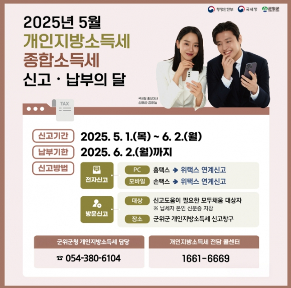 군위군은 납세자의 편의를 위해 종합소득세와 개인지방소득세를 동시에 신고할 수 있는 ‘종합소득세·개인지방소득세 신고창구’를 군위군청 국세·지방세 통합민원실(군청 지하 1층 민원봉사과 내)에서 5월 19일부터 20일 양일간 운영한다고 밝혔다. 종합소득에 대한 과세표준 확정신고·납부 의무자는 관할 지자체장에게 개인지방소득세를 6월 2일까지 신고·납부(성실신고 대상자는 6월 30일까지) 해야한다. 군위군은 수출기업인, 제주항공 여객기 사고 피해자 및 유족 특별재난지역 소재 납세자 대상으로 개인지방소득세 납부기한을 3개월 직권연장(9월 1일까지)할 예정이며, 개인지방소득세 분할납부 규정에 따라 세액이 1백만원을 초과하는 경우 2개월 이내 분납이 가능하다. 종합소득세·개인지방소득세와 관련한 궁금한 사항은 국세상담센터(국번없이 126), 개인지방소득세 전담 콜센터, 군위군청 재무과로 문의하면 안내를 받을 수 있다.