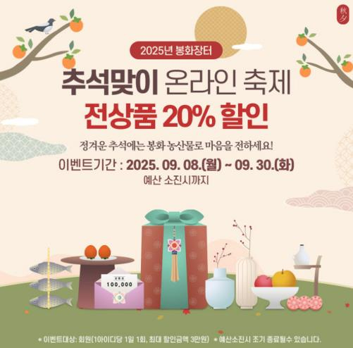 봉화군이 민족 최대의 명절 추석을 앞두고 농업인과 소비자 모두가 함께 누릴 수 있는 특별한 혜택을 마련했다. 9월 8일부터 30일까지 봉화군 공식 온라인 쇼핑몰 ‘봉화장터’에서 ‘2025 추석맞이 온라인 축제’가 진행된다.이번 축제 기간 동안 봉화한우, 봉화사과, 홍도라지조청, 참기름·들기름 세트, 무농약 봉화잣 등 정성과 품질을 담아낸 봉화군의 대표 농·특산물 전 품목을 20% 할인된 가격으로 만나볼 수 있다. 할인 혜택은 봉화장터 회원에게 1인 1일 1회, 최대 3만 원까지 제공되며, 예산 소진 시 조기 종료될 수 있다.이번 행사는 단순한 할인 이벤트를 넘어, 산지 직송의 신선함과 봉화 농산물의 진가를 전국 소비자에게 알리는 자리가 될 전망이다. 입점업체에는 택배비 지원이 함께 이뤄져 농민의 부담을 줄이고, 소비자들은 합리적인 가격에 믿을 수 있는 상품을 받아볼 수 있다.봉화군은 이번 축제를 널리 알리기 위해 온라인 광고, SNS 홍보, 회원 문자발송, 현수막 설치 등 다각도의 홍보 전략을 추진하며, 소비자들의 발길을 봉화장터로 이끌고 있다.박현국 봉화군수는 “추석은 나눔과 감사의 명절이다. 이번 온라인 축제를 통해 봉화 농산물이 더 많은 가정의 밥상과 선물 꾸러미에 담기기를 바란다.”며, “앞으로도 봉화 농·특산물의 판로를 넓히고 브랜드 가치를 높여, 농업인과 소비자가 모두 웃을 수 있도록 힘쓰겠다.”라고 말했다.