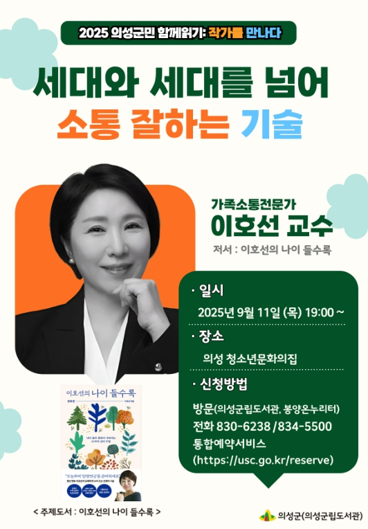 의성군은 오는 9월 11일 의성군 청소년문화의집 공연장에서 가족소통전문가 이호선 교수를 초청해 `세대와 세대를 넘어 소통 잘하는 기술` 북콘서트를 개최한다고 밝혔다.이호선 교수는 숭실사이버대학교 기독교상담복지학과 교수로 재직 중이며, ‘JTBC 이혼숙려캠프: 새로고침’ 등 다양한 방송에서 심리상담 전문가로 활발히 활동하고 있다. 이번 강연에서는 가족과 사회 내 세대 간 공감과 이해를 바탕으로 마음을 열고 소통할 수 있는 대화법을 전할 예정이다. 김주수 의성군수는 “이번 강연을 통해 세대 간 벽을 허물고 서로를 이해하는 소통이 이루어지기를 기대한다”며, “앞으로도 의성군립도서관이 모든 세대가 함께 성장하는 공간이 되도록 노력하겠다”고 말했다.한편, 2025 `의성군민 함께읽기: 작가를 만나다`는 다섯 번째 이호선 북콘서트에 이어 △10.16.(목) 정우철 `내 인생을 바꾼 명화 한 점`△11.27. 이준영`2026 트렌드 코리아`까지 다채로운 강연으로 이어질 예정이다.참가 신청은 도서관 방문 및 전화, 의성군 통합예약서비스를 통하여 접수할 수 있으며 기타 문의 사항은 문의하면 된다.