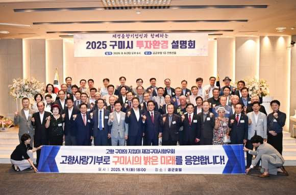 구미시는 지난 9일 서울 영등포구 공군호텔에서 `2025 구미시 투자환경 설명회`를 열고 수도권에서 활동하는 재경출향인과 출향기업인들에게 시정 방향과 투자환경을 소개했다.이번 설명회에는 김장호 구미시장을 비롯해 구자근·강명구 국회의원, 재경구미시향우회원 등 150여 명이 참석해 구미의 발전 비전을 함께 논의했다.이날 행사에서는 기업하기 좋은 도시로 성장하는 구미의 강점을 소개하고, 각종 기업지원 정책을 안내하며 출향인들과의 교류를 강화하는 시간을 가졌다. 특히 재경구미시향우회(회장 박해식)와 출향기업인들은 고향을 향한 정성을 모아 쌀 구매, 장학기금, 고향사랑기부금 등 총 1억8천만 원 상당의 기부금을 전달했다.이날 새로 취임한 박해식 회장은 “수도권에 거주하지만 마음은 언제나 고향 구미와 함께한다”며 “앞으로도 출향인들의 힘을 모아 구미의 미래를 더욱 빛내겠다”고 했다.김장호 구미시장은 “구미의 DNA를 공유하는 출향인들의 성원에 깊이 감사드린다”며 “과감한 투자와 혁신을 통해 기업과 함께 성장하고, 구미를 넘어 세계로 도약하는 자랑스러운 도시를 만들겠다”고 강조했다.