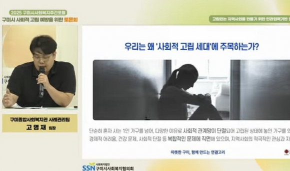 구미시는 지난 10일 새마을테마공원 연수관 회의실에서 사회복지 분야 종사자 80여 명이 참석한 가운데 사회복지주간을 맞아 `사회적 고립 예방을 위한 토론회`를 열었다.이번 토론회는 사회적 고립 문제의 심각성을 알리고, 공공과 민간이 함께 대응할 방안을 찾기 위해 마련됐다. 장애인, 정신건강, 노인, 지역복지 등 다양한 분야의 전문가와 현장 종사자들이 모여 의견을 나누며, 민관 협력을 통한 지역사회 안전망 강화를 강조했다.행사는 ‘사회적 고립이 뇌에 미치는 위험성’을 주제로 한 기조강연으로 문을 열었다. 이어 △구미시 사회적 고립 및 고독사 예방사업 △장애인의 사회적 고립 해소 방안 △정신건강복지센터의 자살예방사업 △재가노인 복지의 예방적 실천 △지역사회보장협의체의 따뜻한 동네 만들기 △민관 협력 기반의 지역 안전망 구축 등 분야별 발표가 이어졌다. 발표자들은 사회적 고립이 단순한 개인 문제가 아니라 지역 공동체 전체에 파급효과를 미칠 수 있음을 강조하며, 예방적 접근의 필요성을 공통적으로 제기했다.이정화 복지정책과장은 “사회적 고립은 개인의 삶의 질을 떨어뜨릴 뿐 아니라 공동체 붕괴로 이어질 수 있는 심각한 사회 문제”라며 “위기 가구 발굴을 강화하고, 사회복지 기관과 단체가 힘을 모아 협력해 달라”고 당부했다.