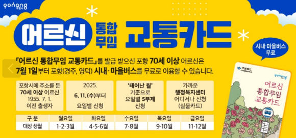 포항시는 오는 7월 1일부터 70세 이상 어르신을 대상으로 시내버스 무료승차 지원사업을 시행한다. 이에 따라 6월 11일부터 지역 내 모든 읍면동 행정복지센터에서 무임 교통카드 발급이 시작된다. 이 사업은 고령화 시대 어르신들의 이동권을 보장하고 외출을 장려해 건강을 증진시키는 한편 사회적 비용을 줄이는 교통 복지 정책으로 추진된다. 특히 포항과 경주, 영덕은 생활권이 겹쳐 상호 간 이동이 잦은 지역으로, 세 도시는 시스템과 제도를 공동으로 정비해 세 지역 어디에서든 시내버스를 무료로 이용할 수 있도록 했다. 어르신 통합 무임 교통카드는 포항시에 거주하는 70세 이상 어르신 약 6만 8천 명이 대상이다. 발급 시 혼잡을 줄이기 위해 주민등록상 출생월을 기준으로 한 ‘5부제’가 적용된다. 월요일은 1~3월생, 화요일은 4~6월생, 수요일은 7~8월생, 목요일은 9~10월생, 금요일은 11~12월생이 해당된다. 시는 카드발급 초기 혼잡을 방지하기 위해 여유를 가지고 발급해 줄 것을 어르신께 당부했다. 카드는 반드시 본인이 신분증을 지참해 방문해야 하며, 현장에서 즉시 발급받을 수 있다. 대리 발급은 불가능하다. 최초 발급은 무료지만, 분실이나 훼손으로 재발급할 경우 수수료 3,000원이 부과된다. 또한 타 지역으로 전출하면 사용이 제한되며, 타인에게 카드를 양도하는 등 부정 사용이 적발되면 1년간 사용이 제한된다. 정정득 건설교통사업본부장은 “이번 사업은 포항 발전을 이끌어온 어르신에 대한 예우이자 교통 복지 향상을 위한 정책”이라며 “카드 발급 5부제 시행과 인력·장비 확충, 대기 장소 마련 등 철저한 준비로 어르신들의 카드발급에 불편이 없도록 노력하겠다”고 말했다.