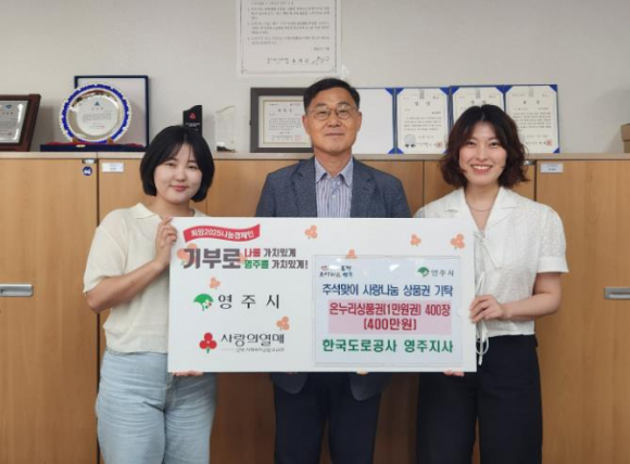 영주시는 지난 11일 한국도로공사 영주지사가 추석을 맞아 지역사회 소외계층을 위해 온누리상품권 400만 원을 기탁했다고 밝혔다.이번 기탁은 한국도로공사 영주지사의 추석맞이 사회공헌 활동 ‘사랑나눔’의 일환으로 진행됐다. 기탁된 상품권은 경북사회복지공동모금회를 통해 읍·면·동 행정복지센터에서 독거노인, 가정위탁아동, 차상위계층 등 40세대에 각 온누리상품권 10만 원씩 전달될 예정이다.한국도로공사 영주지사 관계자는 “민족 최대 명절인 추석을 맞아 지역의 어려운 이웃들에게 힘이 되고 따뜻한 마음이 전해지기를 바란다”며, “앞으로도 지역사회와 함께하는 다양한 사회공헌 활동을 통해 나눔과 상생의 가치를 실천해 나가겠다”고 말했다.정근섭 복지정책과장은 “어려운 이웃을 위해 늘 함께해 주시는 한국도로공사 영주지사에 깊은 감사를 드린다”며 “이번에 기탁해 주신 상품권은 꼭 필요한 분들에게 잘 전달하여 모두가 따뜻하고 넉넉한 추석 명절을 보낼 수 있도록 하겠다”고 밝혔다.한편 한국도로공사 영주지사는 매년 명절마다 400만 원 상당의 기부와 다양한 사회공헌활동을 꾸준히 이어오며 지역사회 나눔을 실천하고 있다.