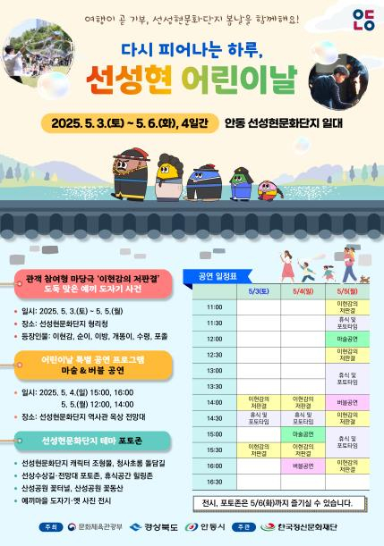안동시와 한국정신문화재단은 관광거점도시 육성사업의 일환으로, 어린이날 연휴를 맞아 도산권역 첫 관광지인 예끼마을과 선성현문화단지를 찾는 관광객들을 위해 5월 3일부터 5월 6일까지 4일간 ‘다시 피어나는 하루, 선성현 어린이날’ 행사를 개최한다.산불로 인해 4월에 예정돼 있던 ‘예끼마을 봄소풍’행사가 취소되고 관광객 또한 감소했으나, 5월 연휴를 맞아 선성현문화단지 한옥체험관의 전 객실이 예약되는 등 지역 경제가 다시 살아나고 있다. 이에 발맞춰 ‘여행이 곧 기부’라는 관광 활성화 캐치프레이즈 아래 예끼마을과 선성현문화단지도 다‘시 피어나는 하루’라는 주제로 어린이날 프로그램을 진행한다.옛 관아를 재현한 선성현문화단지를 재발견할 수 있는 관객 참여형 마당극 ‘이현감의 저 판결, 도둑맞은 예끼 도자기 사건’과 함께 어린이들을 위한 마술과 버블 공연이 진행되며, 선성현 캐릭터가 함께하는 청사초롱 돌담길, 봄기운을 만끽할 수 있는 힐링존과 같은 다양한 포토존도 설치해 멋진 추억을 선물할 예정이다.또한 예끼마을 내 예갤러리에서는 마을 주민들이 손수 제작한 도자기 전시와 함께 도자기 빚기 체험도 진행되며, 수몰 전 예끼마을의 모습을 사진으로 볼 수 있는 옛 사진도 전시된다.새롭게 조성돼 선성수상길과 안동호를 조망할 수 있는 선성현문화단지 전망대에는 대형 의자를 설치하는 등 다양한 포토존과 휴식공간을 조성하고, 산성공원에는 수만 송이의 튤립과 수선화, 꽃잔디를 식재하고 꽃터널도 조성해 방문객들에게 봄의 향기를 전할 예정이다.안동시 관계자는 “예끼마을과 선성현문화단지를 찾는 가족 단위 관광객들에게 다채로운 봄 특화 문화체험으로 풍성한 즐거움과 함께 특별한 추억을 선사할 것으로 기대한다”며 “성금 및 물품 기부와 함께, 안동을 여행하며 기부하는 방법도 있으니 많은 관심과 방문을 부탁드린다”고 밝혔다.