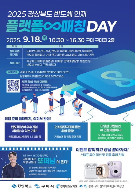 경상북도는 18일 구미컨벤션센터에서 도내 반도체 기업, 반도체 특성화 대학·고등학교, 기타 공공기관 등 400여 명이 참석한 가운데 ‘반도체 인재 플랫폼-매칭 데이’를 개최했다.이날 행사는 경북에서 기업과 학교 연합으로 처음 열리는 반도체 분야 취업 박람회로 반도체 분야 진출을 희망하는 대학(원)생, 특성화고 학생, 청년 구직자 등에게 채용 정보와 현장 면접 기회를 제공해 실질적인 취업 가능성을 높이는 동시에 기업은 인재 확보를 위한 맞춤형 채용을 지원하기 위해 마련됐다.홈페이지를 통한 사전 채용 공고와 구직자, 기업 간 연계 프로그램을 병행해 운영된 이날 행사에는 SK실트론, LB세미콘, 원익QnC, 에이프로세미콘 등 15개 도내 반도체 기업이 참여했다.참여 기업들은 채용 상담 및 현장 면접 등을 활발히 진행했으며, 특성화 교육기관 등에서는 최신 반도체 기술 공유, 인력양성 프로그램 체험 등을 추진했다.참가자들의 취업 역량 강화를 위해 취업 추세·준비 전략 특강, 유튜브 창작자 ‘또떠남(정동윤)’의 명사 특강 ‘내 삶의 진정성-10년 후 커리어를 만드는 숨은 비결’이 진행됐으며, 체험 부스에서는 인공지능(AI) 모의 면접, 이력서 사진 촬영, 이미지 컨설팅 등 다양한 취업 지원 서비스가 제공돼 구직자들의 큰 호응을 얻었다.행사장 한쪽에는 기업, 대학, 특성화고 간 연계를 가질 수 있는 공간을 마련해 정보를 교류할 수 있도록 했으며, 이날 행사 종료 후에도 상호 간에 협력할 수 있는 계기를 마련했다.또한, 반도체 산업 발전과 지역 경제 활성화에 이바지한 SK실트론, LB세미콘, ㈜써니텍, ㈜이레테크 등 4개 기업에는 감사패를 수여했다.양금희 경상북도 경제부지사는 “오늘 행사는 경북에서 최초로 열리는 반도체 분야 취업 박람회로 반도체 산업에 뜻을 가진 구직자, 기업, 교육기관 모두에게 새로운 기회의 장이 될 것”이라며, “경북의 반도체 인력 양성을 통해 육성 된 인재가 지역의 반도체 기업에 채용되는 선순환 구조의 인력 매칭으로 청년과 기업 모두가 함께 성장할 수 있는 환경 조성을 위해 지속적인 노력을 기울 일 것”이라고 밝혔다.