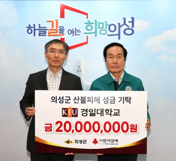 의성군은 경일대학교(총장 정현태)가 최근 발생한 대형 산불로 피해를 입은 지역 주민을 위해 2천만원의 성금을 기탁했다고 밝혔다.이번 기탁식은 지난 29일 13시 30분 의성군청 2층 군수실에서 진행됐으며, 경일대학교 측에서는 홍재표 부총장, 장규하 기획처 부처장, 윤성일 평생교육원 원장, 송니은 교수 등 총 4명이 방문했다. 기탁된 성금은 경북사회복지공동모금회를 통해 산불 피해 복구 및 이재민 지원에 사용될 예정이다. 홍재표 부총장은 ˝2024년부터 의성군과 협약을 맺고 추진하고 있는 의성캠퍼스를 계기로 의성과의 인연이 깊어진 가운데, 산불 피해 소식을 접하고 마음이 무거웠다.˝라며 ˝총장을 비롯한 모든 임직원의 뜻을 모아 성금을 전달하게 됐고, 피해 주민들과 의성캠퍼스 학생들에게 작은 위로가 되길 바란다˝라고 전했다. 의성군과 경일대학교는 지난 2024년 업무협약을 체결하고, ‘경북미래라이프대학 의성캠퍼스’ 내 ‘지역특화산업학부’를 정식 개설해 운영 중이며, 현재 총 80명의 성인 학습자(1학년 40명 및 2학년 40명)가 재학 중이다.김주수 의성군수는“ 경일대학교에서 따뜻한 나눔에 깊이 감사드리며, 하루빨리 피해복구를 마치고, 군민들이 평온한 일상을 되찾을 수 있도록 최선을 다하겠다”라고 전했다.