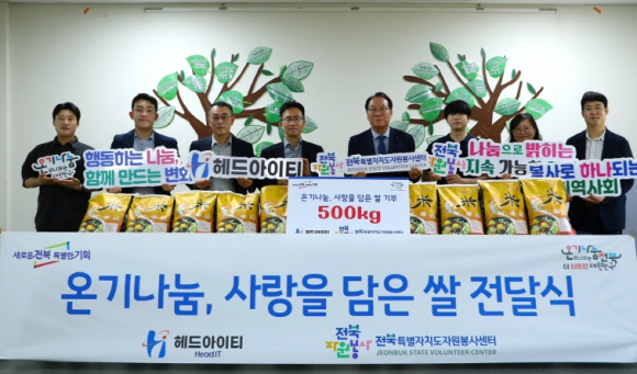 전북특별자치도자원봉사센터는 ㈜헤드아이티(Head IT)와 협력하여 온기 나눔, 사랑을 담은 쌀 전달식을 4월 30일 진행했다고 밝혔다.이번 전달식은 지역사회 소외계층을 돕기 위한 쌀 기부를 통해 기부와 나눔의 문화를 널리 확산시키는 중요한 의미를 지닌다. ㈜헤드아이티는 지역사회의 소외된 이웃들에게 쌀 50포대(10kg)를 기부했으며, 기부된 쌀은 도자원봉사센터를 통해 필요한 이웃들에게 전달될 예정이다. 이 나눔의 손길은 소외계층에게 큰 도움이 될것으로 기대된다.김재환 대표는 “이번 기부를 통해 어려운 이웃들에게 작은 희망과 따뜻한 마음을 전할 수 있어 매우 기쁘다”며 “앞으로도 지속 가능한 사회공헌 활동을 통해 기부와 나눔 문화를 더욱 널리 확산시킬 수 있도록 노력하겠다”고 말했다.고영호 이사장은 “이번 전달식은 단순히 쌀을 기부하는 것에 그치지 않고, 자원봉사 활동을 통해 지역사회에 긍정적인 영향을 미치는 계기로 자리잡을 것으로 기대된다”고 밝혔다.㈜헤드아이티는 사회적 책임을 다하는 기업으로 지역사회와의 지속 가능한 파트너십을 강조하며, 이번 기부 외에도 다양한 사회공헌 활동을 펼치고 있다. 이를 통해 지역사회의 발전에 기여하고, 나눔의 문화가 더욱 확산될 수 있도록 노력할 방침이다.
